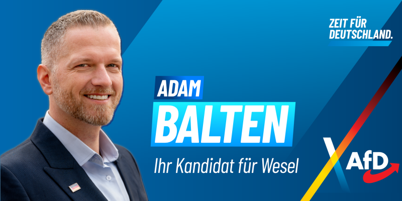 Ich bin Adam Balten. Es ist mir eine Ehre, mich heute als Ihr Kandidat für den Bundestag vorzustellen. Ich bin auch Direktkandidat für meinen Wahlkreis Wesel.